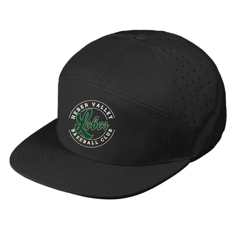 A PERFORMANCE, BLANK 7 PANEL HAT WITH A FLAT BILL, LASOR PERFORATED BACK PANELS, MOISTURE CONTROL PREMIUM SWEATBAND, & CLASSIC SNAPBACK.