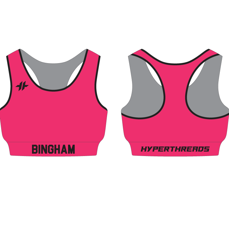 Our sports bra is designed for medium level support and comfort for longer endurance activities. A wide, encased lower elastic hem is comfortable and does not pinch. Racerback design is supportive, secure and allows for a small, flat pocket for phone or music player between the shoulder blades.