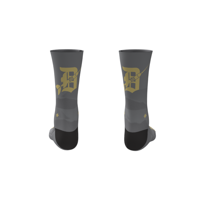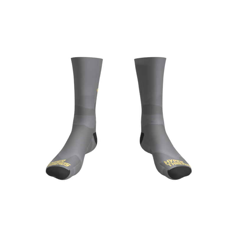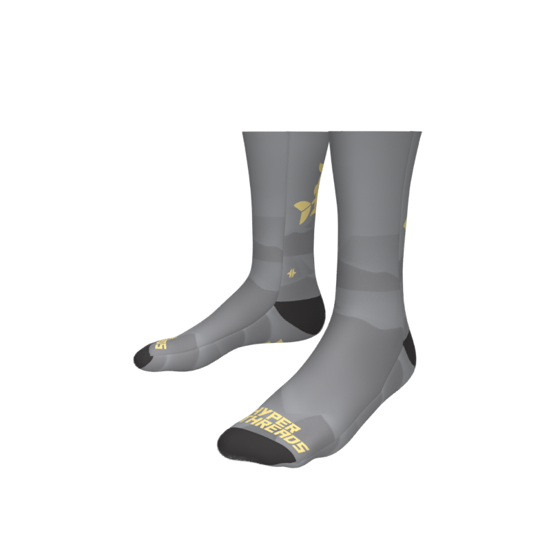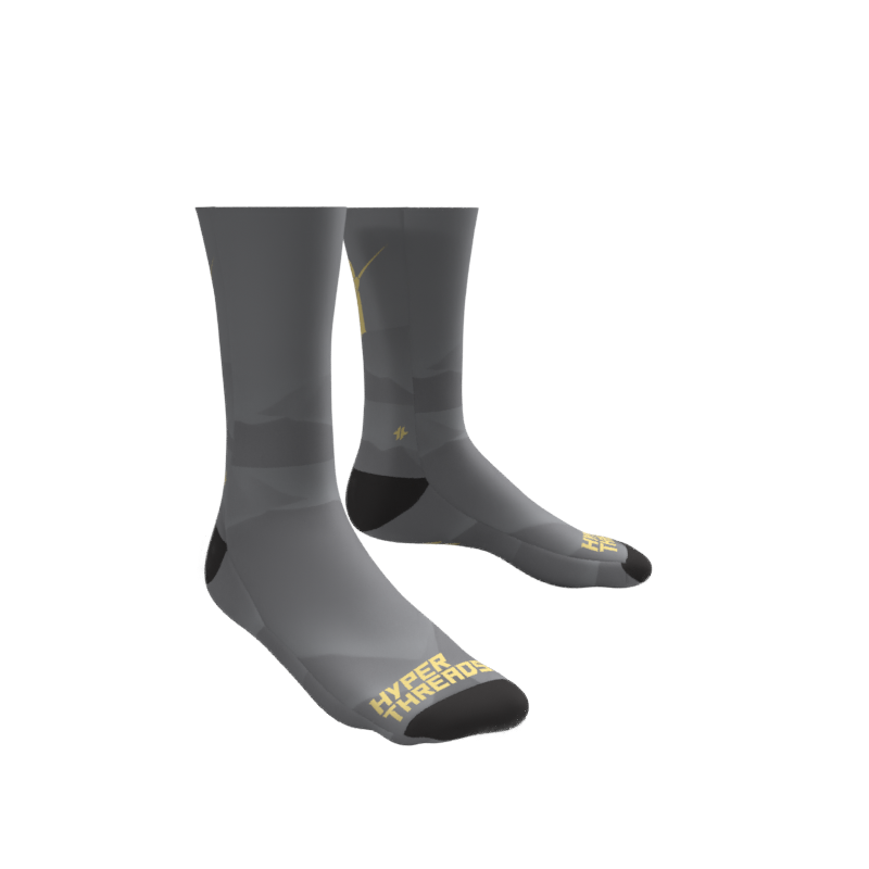 Full Color/Full Coverage full performance socks with your custom design permanently printed right into the fabric! Black reinforced heel and toe box. Polyester and a special stretch yarn wrapped in polyester for an incredible color matching end product that allows for an incredibly unique and creative sock!