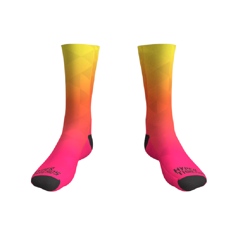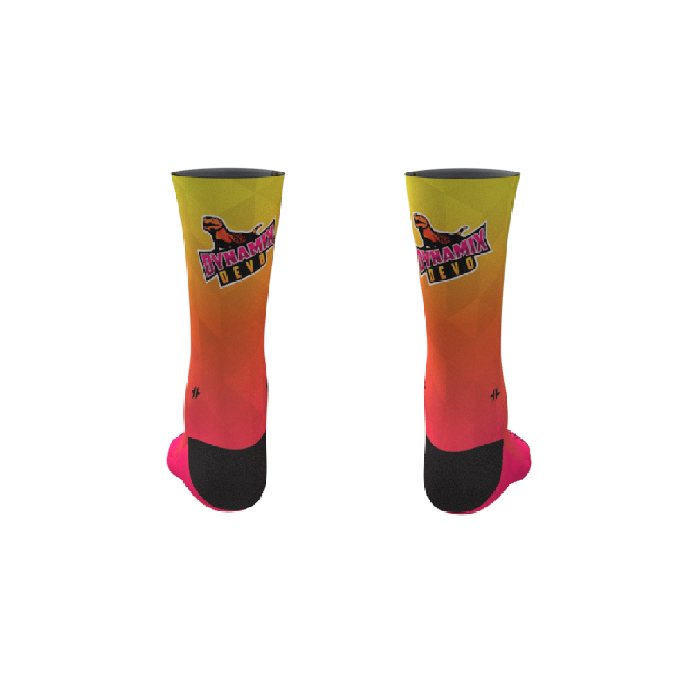 Full Color/Full Coverage full performance socks with your custom design permanently printed right into the fabric! Black reinforced heel and toe box. Polyester and a special stretch yarn wrapped in polyester for an incredible color matching end product that allows for an incredibly unique and creative sock!