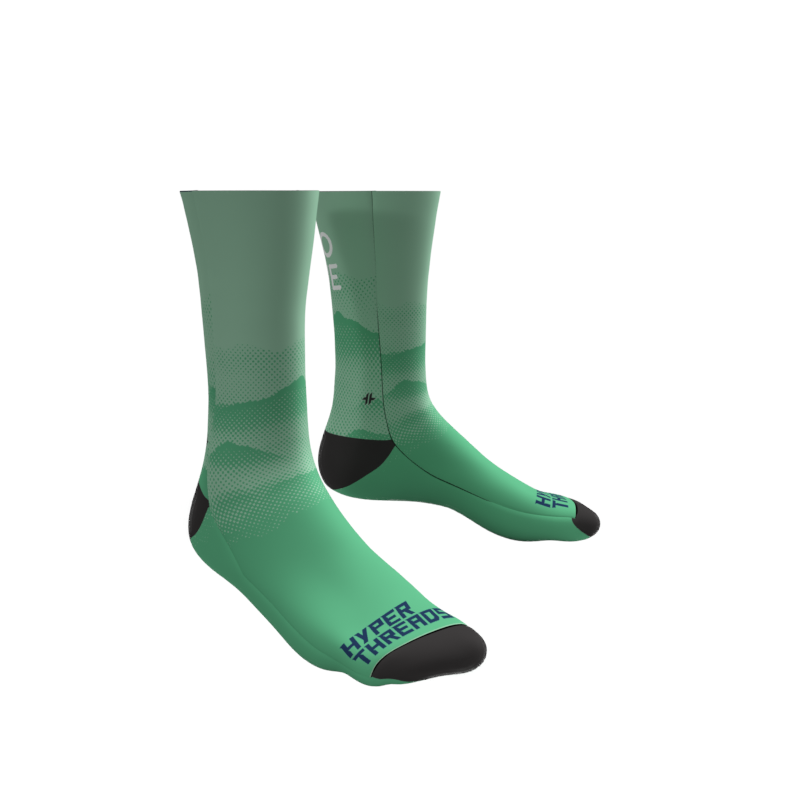 Full Color/Full Coverage full performance socks with your custom design permanently printed right into the fabric! Black reinforced heel and toe box. Polyester and a special stretch yarn wrapped in polyester for an incredible color matching end product that allows for an incredibly unique and creative sock!