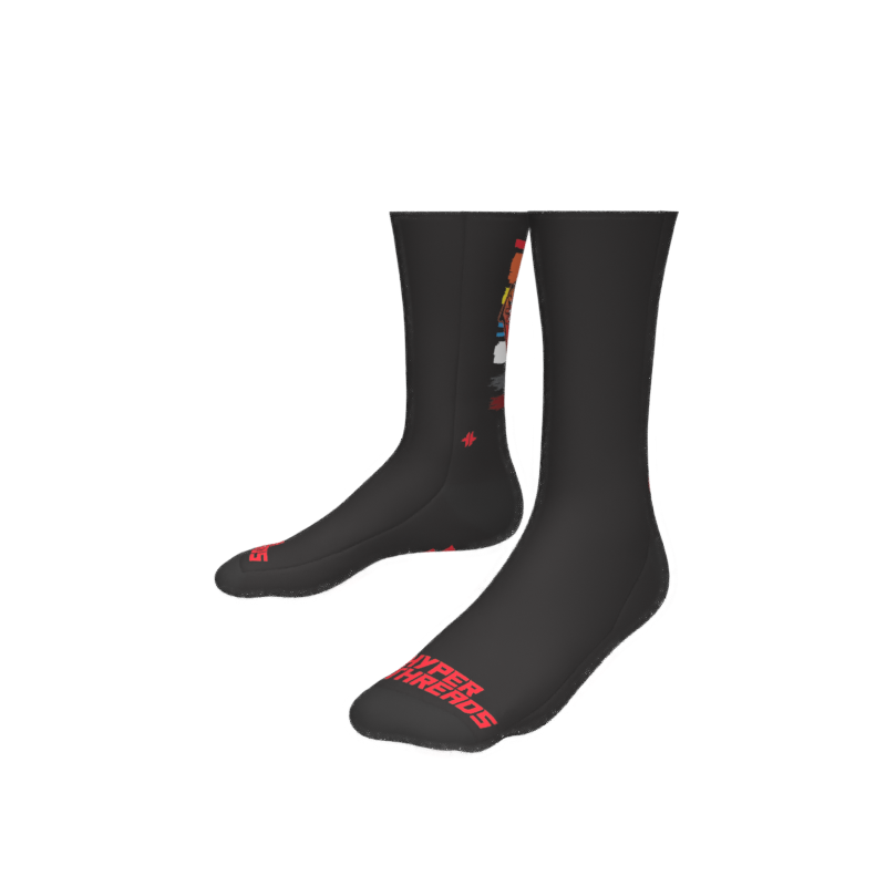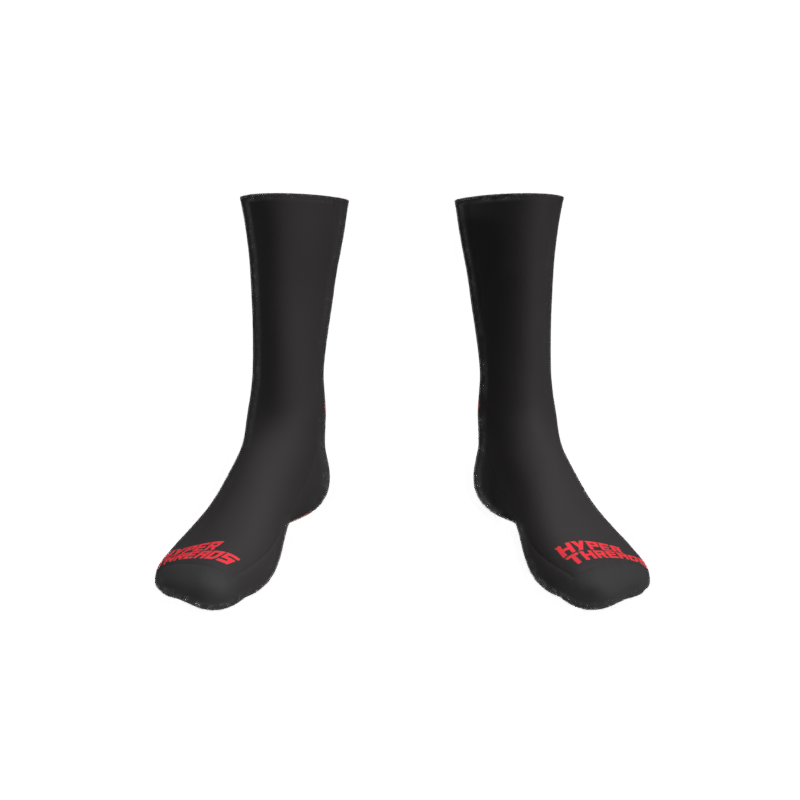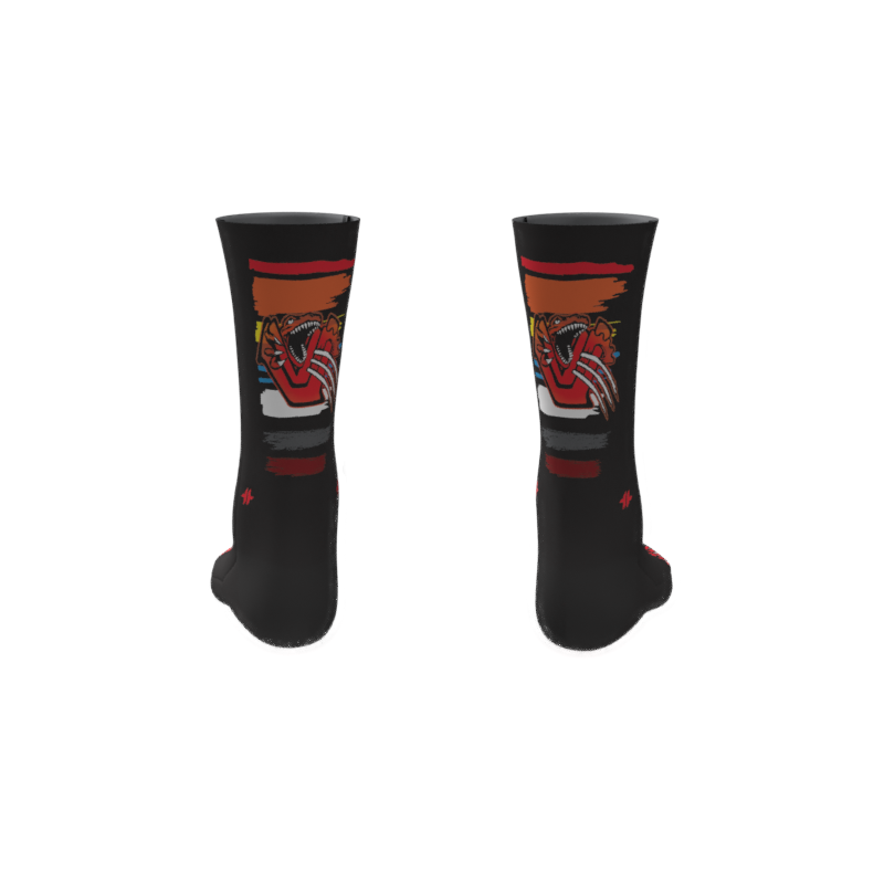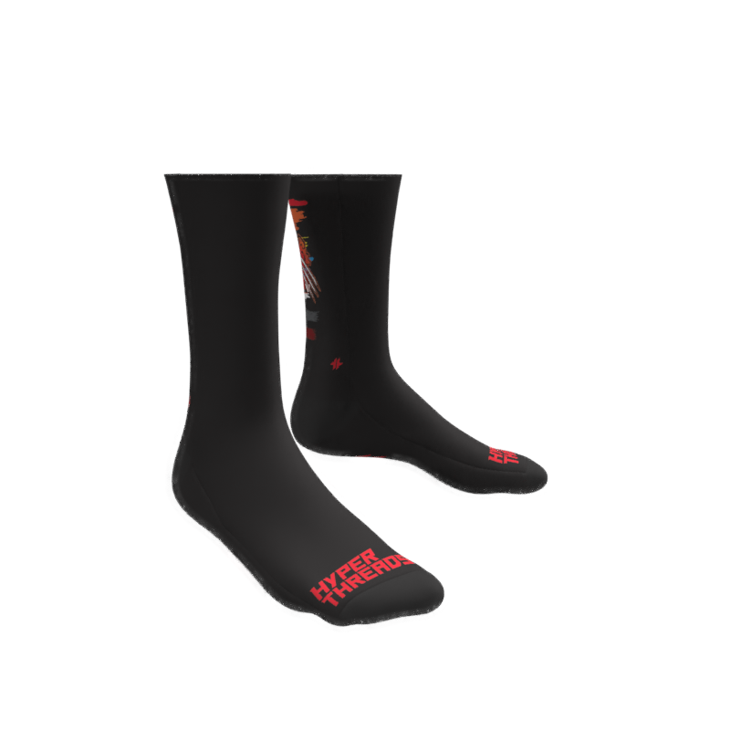 Full Color/Full Coverage full performance socks with your custom design permanently printed right into the fabric! Black reinforced heel and toe box. Polyester and a special stretch yarn wrapped in polyester for an incredible color matching end product that allows for an incredibly unique and creative sock!