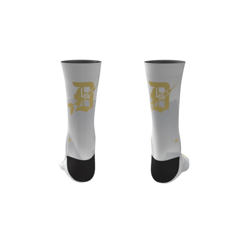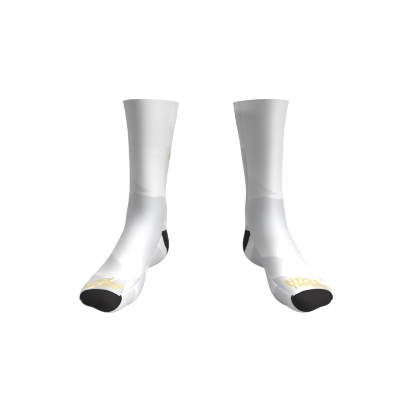 Full Color/Full Coverage full performance socks with your custom design permanently printed right into the fabric! Black reinforced heel and toe box. Polyester and a special stretch yarn wrapped in polyester for an incredible color matching end product that allows for an incredibly unique and creative sock!